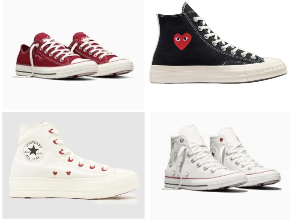 - Chuck Taylor All Star Hearts (Low & High) – Valentine’s Day twist on the classic Chuck with embroidered text, heart tongue and eyelets, strap and license plate accents, two shoelace options, and soft foam cushioning.